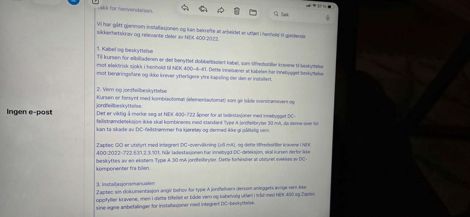Installeringmanualen for Zaptek Go datert 12.04.2023 sier også at den trenger en forankoblet jordfeilbryter type A med utløsestrøm på 30 mA.»